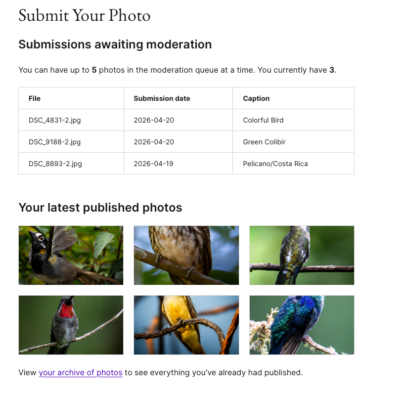 - Las fotos con el ave claramente visible y enfocada tienen mayor probabilidad de aprobación.