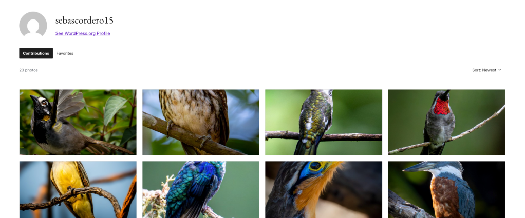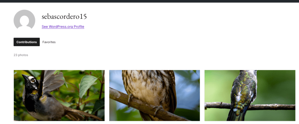 El perfil en wordpress.org/photos/@sebascordero15 ya muestra las primeras fotos aprobadas visibles para cualquier persona en el mundo. Ver las imágenes de aves publicadas en el directorio global de WordPress es la confirmación más concreta del impacto real de esta contribución.